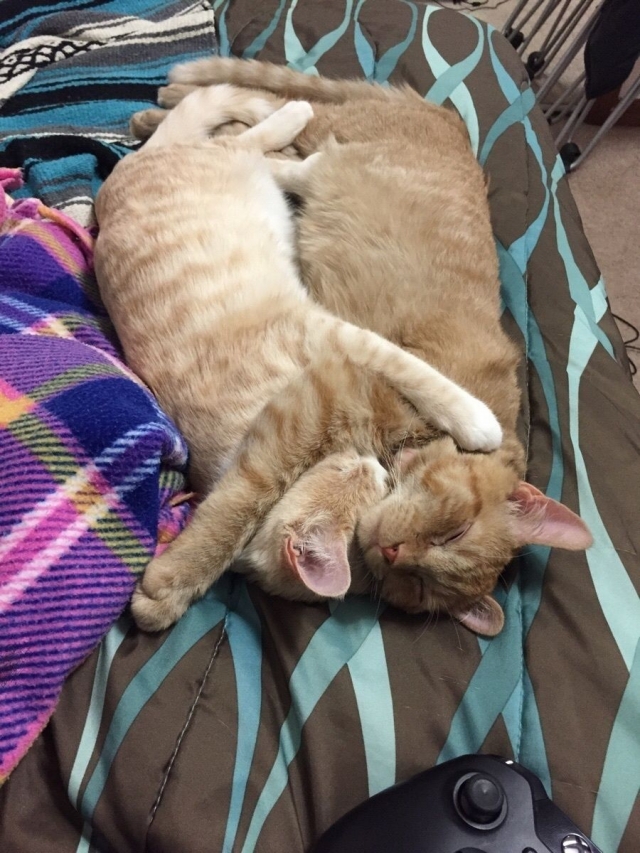 Wat is het zalig om samen op een warm plekje te liggen en met onze kopjes en voorpootjes elkaars aanwezigheid te bevestigen . Geborgenheid schept een band en geeft een goed gevoel . Dit is 100 % genieten , dus stoor ons niet !