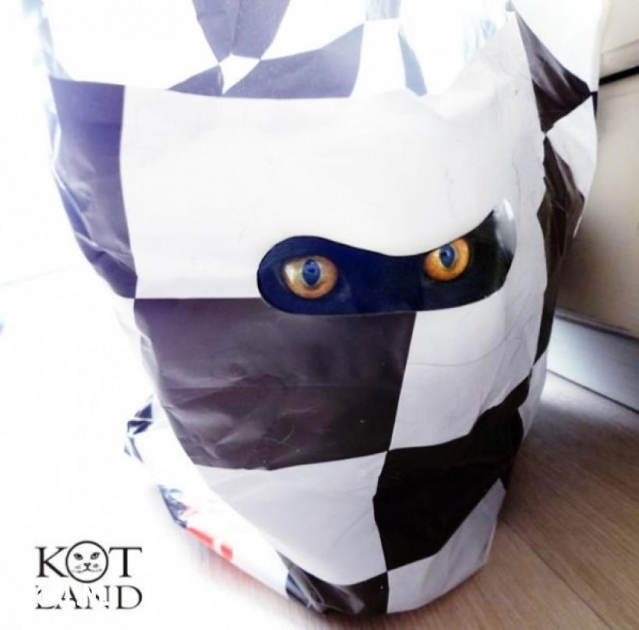 Sommigen vinden poezen een ras apart : wij kunnen heel verrassend uit de hoek komen ... Door de handvatopening van een plastieken tas geef ik mijn gele oogjes volop de kost . Misschien denk je wel aan een spook ... Prettig gestoord ? Schattig en grappig in ieder geval !