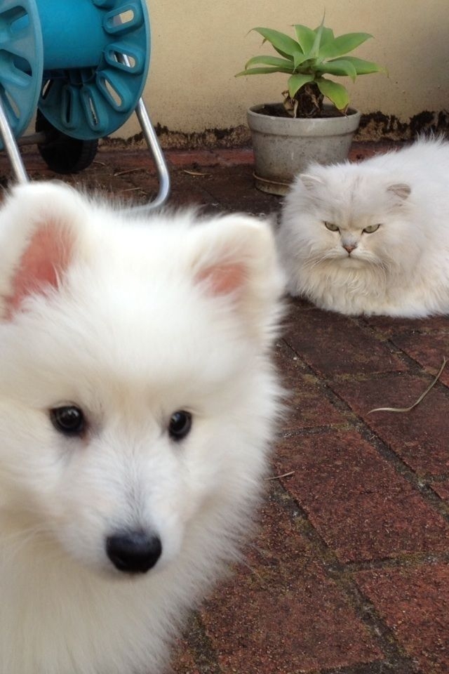 Woef en ik hebben beiden een spierwitte , pluizige vacht . Toch is ons karakter anders en noemen elkaar wel eens " mormel " . Dat zeggen we wanneer we het niet eens zijn . Dit woordje keurt dan de ander af : waar het hart van vol is , loopt de mond van over !