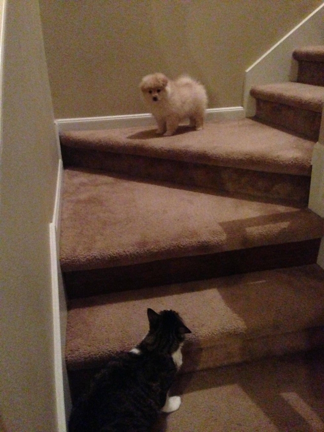 Ik sluip op mijn fluwelen pootjes naar boven , maar bots op een koddig schoothondje dat op bezoek is . Ik vraag : " Wat doe je hier mormel ? " Verbaasd staart hij me aan en laat zijn oren hangen . Beledigingen is hij niet gewoon . Zal ik hem nogmaals op zijn tenen trappen ?