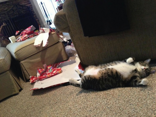 Kijk eens hoe poeslief ik op mijn ruggetje lig : ik ben onschuldig ... Ik heb al de pakjes bekeken en besloten om de geheimen ervan te ontsluieren . Dan hoeven jullie niet meer nieuwsgierig te zijn ... Weg met de papieren verpakking dus , maar waar blijft mijn pakje ? Je schattebout kan je toch niet vergeten !