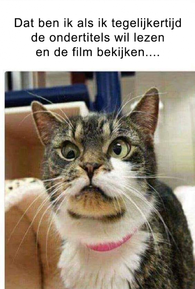 De pupillen van mijn oogjes zijn niet evenwichtig georiënteerd ... Daardoor is het moeilijk om tegelijkertijd ondertitels te lezen en de film te bekijken . Maar ik troost me : mannen kunnen ook maar één ding tegelijkertijd . Dat is zo waar als een klontje !