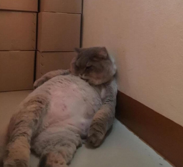 Met mijn kop tegen de muur en voor een stapel kartonnen dozen lig ik op de grond . Weldra worden mijn kittens geboren , dus laat me met rust ... Ik zal al mijn energie nodig hebben . Een nieuwe lente , een nieuwe wereld !