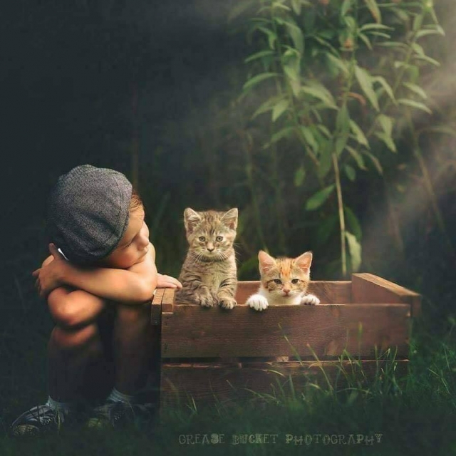 Wij , kittens , zitten in een houten bakje en observeren de groene omgeving . Tom heeft ons hierheen gebracht en wil weten hoe we reageren in deze voor ons vreemde omgeving . Tijgertje is avontuurlijker en wil wel een sprongetje maken , maar ik ben voorzichtiger en verkies in het bakje te blijven . Eenheid in verscheidenheid dus !