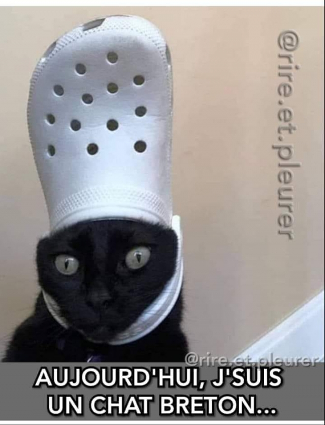 Ik ben dol op witte , rubberen sandaaltjes : ze geven me het uitzicht van een Bretoense kat . Omdat ik een zwarte pels heb , vormt dit hoofddeksel een contrast . Bovendien bevat het luchtgaatjes wat het dragen ervan aangenamer maakt . Schrijf me ook maar in om aan de folkloristische stoeten deel te nemen : dan ben ik zeker de schattige blikvanger !