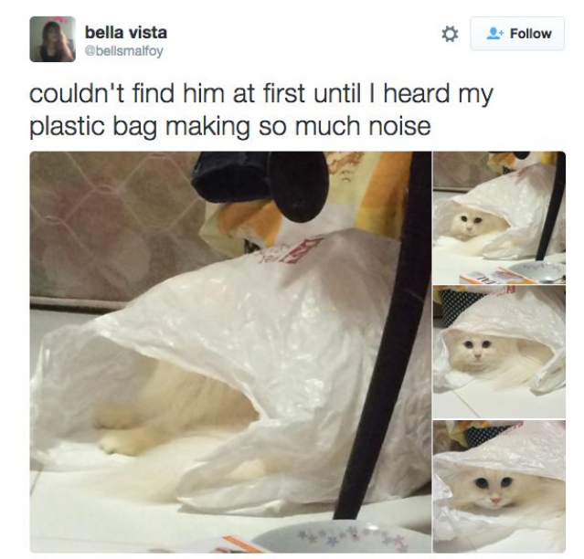 Kan een wit poesje zich in een witte , plastieken zak verschuilen ? Als het er volledig inkruipt , zijn alleen de oogjes zichtbaar als het komt piepen . Geen wonder dat men het niet opmerkt ... Kan een levenloos voorwerp plots geluid maken ? Met een poesje er binnenin is alles mogelijk natuurlijk !