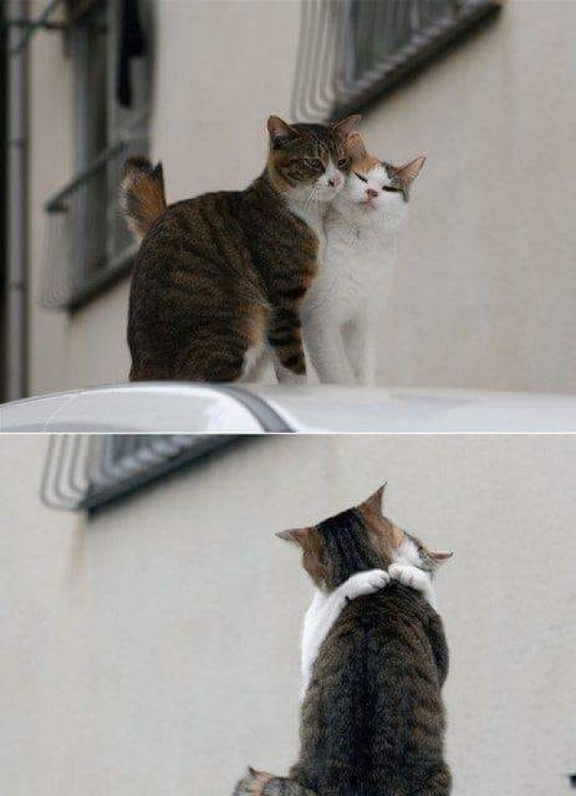 Grote liefde in het poezenrijk ... Wang aan wang samenzitten of zelfs de pootjes rond het kopje van de ander slaan , tonen de diepe emoties van de poezenliefde . Het verliefde koppeltje ziet alles door een roze bril , maar hoe lang duurt het ?