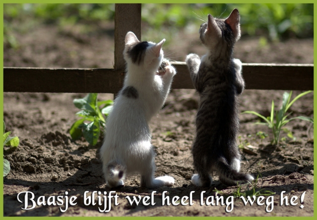 Wij staan op wacht en denken aan jou ... ons vriendelijk baasje . Om ons geduld te ondersteunen , houden we onze voorpootjes aan een plank van de omheining vast . Baasje blijft wel heel lang weg , vinden we . Ons staartje zwiept heen en weer : we worden wat zenuwachtig . Waarom blijf je niet bij ons ? Samen gezellig in de tuin en graag " horizontaal " !