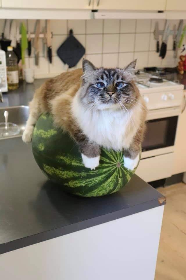 Ja , lach maar ... hoewel ik een tikkeltje loens , ben ik erin geslaagd om bovenop een grote watermeloen te klimmen die op het randje van het aanrecht ligt . Mijn pootjes hangen ontspannen naar beneden , maar mijn gewicht houdt mijn trofee in evenwicht . Riskeer het niet hem af te pakken , want dan schiet ik in mijn Spaanse colère !