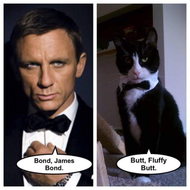 Zowel James als Fluffy dragen een strikje om hun hals : ze houden van etiquette . Hun ogen kijken je arrogant aan , want ze houden van superioriteit . Met die streken bekoren ze sommigen , maar anderen vinden hen hautain : wat wit is voor de ene , is dan weer zwart voor de andere . Bond of Butt , niet alleen de kleren maken de man !