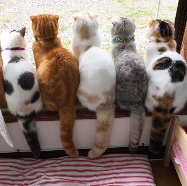 Samen gezellig voor het raam , maar hun pelsje verwijst naar een verschillende identiteit ... Wie is er het mooiste ? Over smaak valt niet te discuteren , want het is erg subjectief . Ze beschikken alle vijf over een glanzende pels en een leuk staartje . Daarom krijgen ze allemaal een medaille voor eenheid in verscheidenheid !