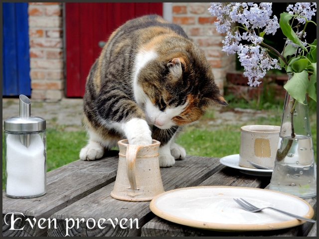 Wat ben ik blij : het kannetje met verse melk staat er nog bij ... Waarom krijg ik nu altijd water ? Het is beter voor mijn dieet , zeggen ze . Maar ik ben het er niet mee eens : er gaat niets boven volle , lekkere melk . Is de slanke lijn ook een streefdoel voor poesjes ? Geef mij maar het mollige type : ronde vormen zijn snoeziger !