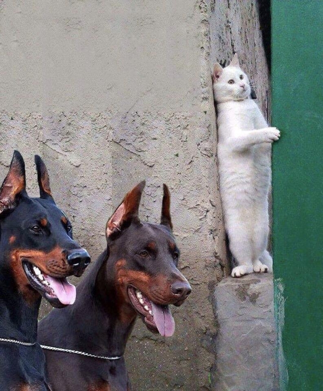 Ik sta rechtop , achter een muurtje , en hou me koest , want twee grote loebassen verkennen de omgeving . Met hun tong uit de mond speuren ze naar de dader van het misdrijf : er is een prachtige vogel aangevallen . Ik heb er niets mee te maken : niks gezien ... Een leugentje om bestwil ?