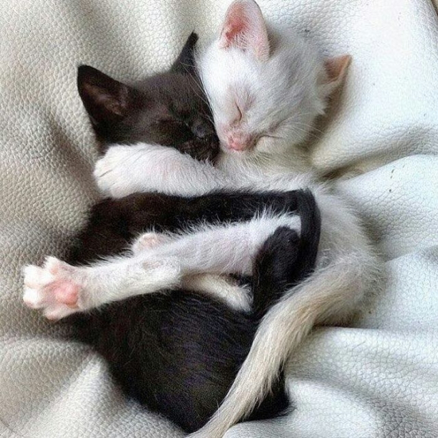 Zijn we " ying en yang " omdat we een witte en zwarte pels hebben ? Men zegt dat tegengestelden elkaar aantrekken en dat bewijzen we . Met onze pootjes en snoetjes vormen we een lieflijk geheel , want dicht bijeen is warm . Dikke vrienden streven naar één ziel in twee lichamen !