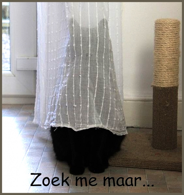 Zoek me maar : het begijntje achter het gordijntje ... Ik leef heel vroom en heb van verstoppertje spelen mijn hobby gemaakt . Ik wil observeren zonder dat je het in de gaten krijgt . Ben ik erin geslaagd ? Zwarte poesjes houden van mysteries !