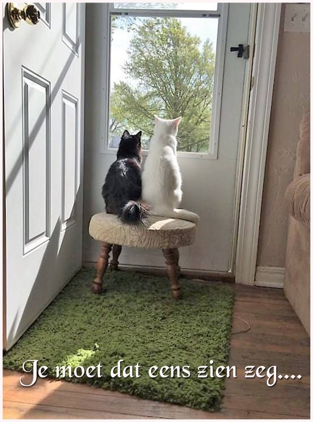 Als een witte en een zwarte poes samen naar de tuin kijken , wordt dan hun uitzicht grijs ? Ontdekken ze eksters die op zoek gaan naar verse pieren in het natte gras ? Vlijtig woelen die de grond om , want op één been kun je niet staan ... Ieder heeft ruimte nodig anders gebeuren er schermutselingen . Je moet dat eens zien , zeg ...