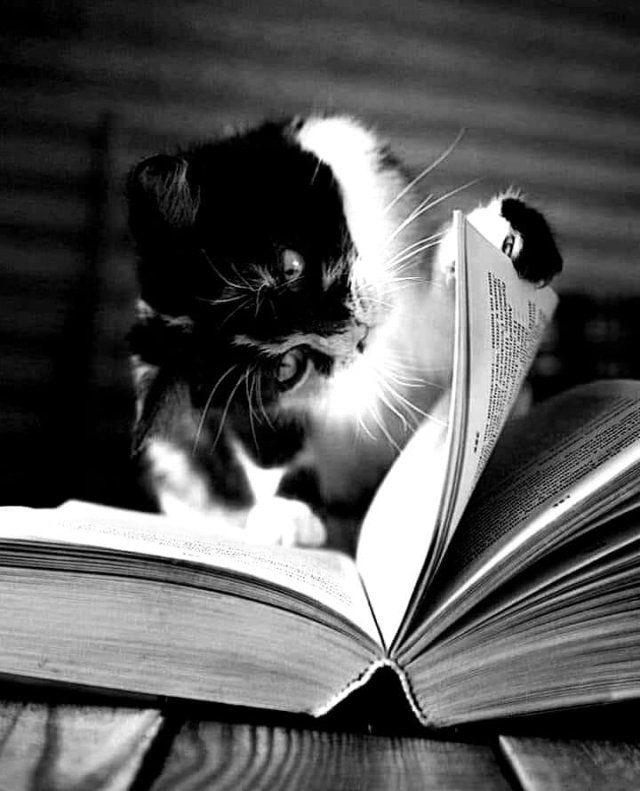 Wat staat hier geschreven ? Af en toe doe ik beroep op boekenwijsheid : de overbevolking van katten wordt sterk afgeremd ... Wij zijn roofdieren die andere , plaatselijke , kleine dieren bedreigen . Daarom moet ons aantal verminderen . Wat jammer , want we zijn razend charmant !
