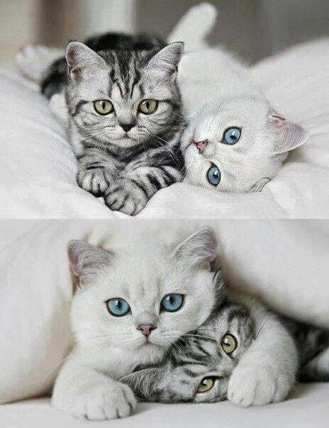 Een tijgerkatje en een wit poesje stoeien erop los ... Met hun gele en blauwe oogjes houden ze ons in de gaten : zorgen we voor een aangenaam tijdverdrijf ? We zijn immers dikke vrienden die elkaar door dik en dun zullen steunen . Schattig en grappig gaan we door het leven . Fantastisch , toch !