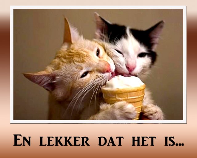 Njam , njam , njam ... en lekker dat het is ... Wij zijn zot van ijsjes , omdat we nu verplicht zijn om water te drinken in plaats van romige melk . Zo smullen we toch nog van zuivel ... Met beide pootjes houd ik het hoorntje vast en lik er maar op los , terwijl mijn vriend ook af en toe een likje waagt . Ik wens iedere dag een bolletje ijs en dat wil ik niet missen voor geen prijs !