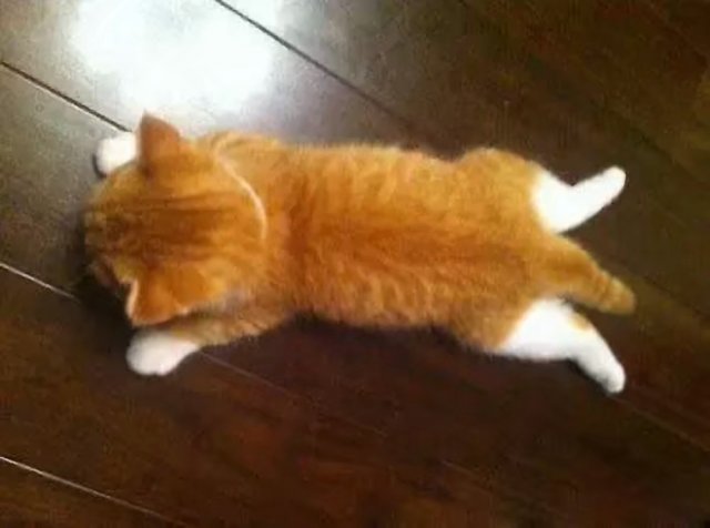 Door op een gladde parketvloer te lopen , worden mijn kleine pootjes ontzettend moe . Laat me nu maar liggen om op adem te komen ... Waarom deze poes onvriendelijke vloerbedekking installeren als je " zogezegd " van kittens houdt ? Glijden jullie ook graag uit ? Bedek de vloer liever met een zacht , mooi tapijt : daarover ontstaat zeker geen spijt !