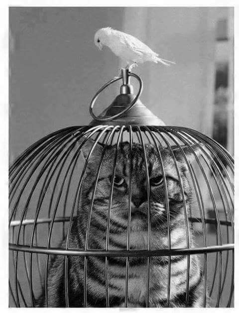 Ik schaam me rot , want ik zit in een vogelkooitje gevangen . Er bovenop inspecteert een witte vogel als een cipier en hij lacht in zijn vuistje . De omgekeerde wereld is waarheid geworden ... " Verwisselen ?" stel ik voor . " Blijf in uw kot , " gebiedt hij streng , " de virusepidemie overleven is primordiaal . " Geduld is een mooie deugd !