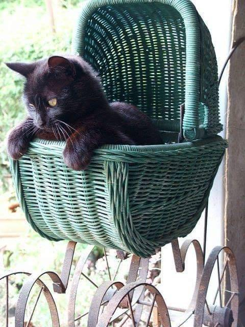 Wat vind ik het gezellig in het kleine , rieten wiegje ... Met mijn voorpootjes over de rand gluur ik naar de mooie tuin met veel groen en leuke bloempjes . De rieten kap beschermt me tegen te felle zonnestralen . Wat is het leven zalig als je zo'n comfortabel nestje hebt . Groetjes van Snoes , de poes !