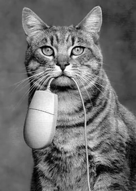 Ik heb een muis gevangen met een hele , lange staart ... Met deze moderne versie kan ik op het internet terecht en me verkneukelen aan het sociale leven van andere poesjes , waardoor ik me minder eenzaam voel . Toch is dit maar een magere troost : zo'n spits snuitje , warm pelsje en wiebelend staartje heeft mijn voorkeur . Zoek je mee naar de pluizige trofee ?