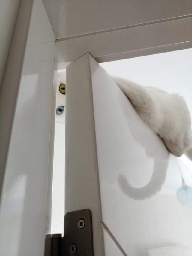 Met mijn witte pels val ik niet op , zelfs al lig ik op de bovenkant van de deur in deze sneeuwwitte kamer ... Toch gluren een geel en blauw oogje door een spleetje naar je reactie . Eerst merk je niets op , want de berichten op je computer eisen je volledige aandacht . Dan denk je na en staart naar boven ... " Miss kattenkwaad ligt weer zoals ze wil ... " mompel je !
