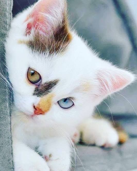 Heb ik een originele , lieve snoet waardoor ik meteen opval ? Een geel en blauw oogje vragen zich dat af ... Met een oranje plekje op mijn neusje en een grijs veegje nabij mijn geel oogje wordt mijn wit pelsje opgevrolijkt . Bovendien duiken grijsbruine haartjes op uit mijn rechter oortje . Wat een combinatie : de natuur is onvoorspelbaar !