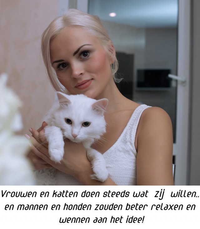 Vrouwen en katten doen steeds wat ze willen ... Mannen voelen zich in hun nopjes als hun hond hen gehoorzaamt ... Wie toont het meeste respect voor elkaar ? Daar bestaat geen twijfel over : de charme van lief en zelfstandig primeert . Mannen moeten meer op de vingers getikt worden : luister beter naar de behoefte van de andere !