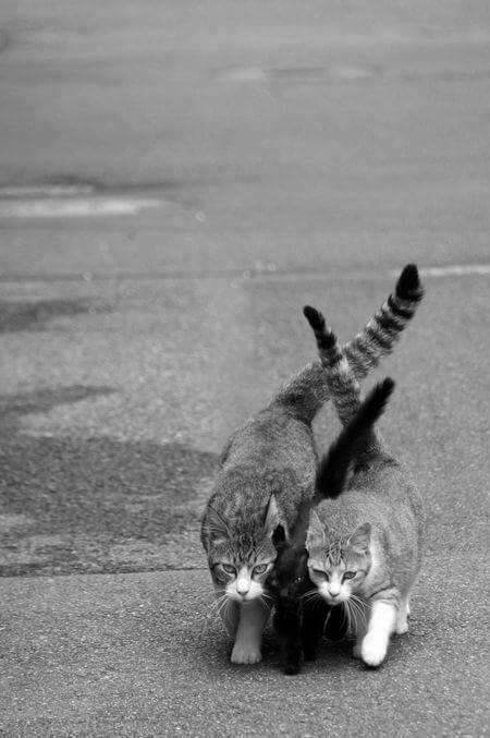 Eendracht maakt macht ... Met de sterkste flanken aan de buitenkant en de zwakste aan de binnenkant trotseren we de bedreiging van Woef . Met onze drie staarten rechtop tonen we eensgezind ons verzet : hij zal een geduchte tegenstander ontmoeten die niet achteruit deinst ... of blijft het bij : blaffende honden bijten niet ?