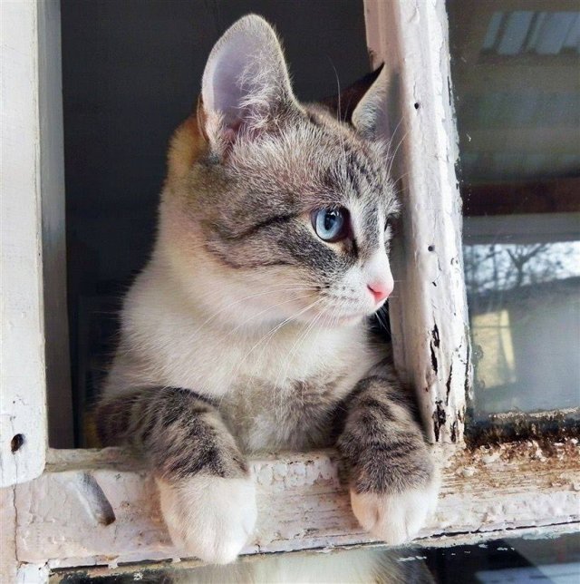 Met mijn pootjes over de rand van het open raam kijk ik de tuin in ... Wat trekt mijn aandacht ? Hoe is het mogelijk dat Woef weer snuffelt op mijn territorium ? Heeft hij de smalle doorgang weer ontdekt ? Daar zou ik een stokje voor moeten steken met de hulp van mijn baasje . Als die weer hondendrolletjes vindt , wordt hij rood van woede . Daarom kijk ik zo graag door het raam !