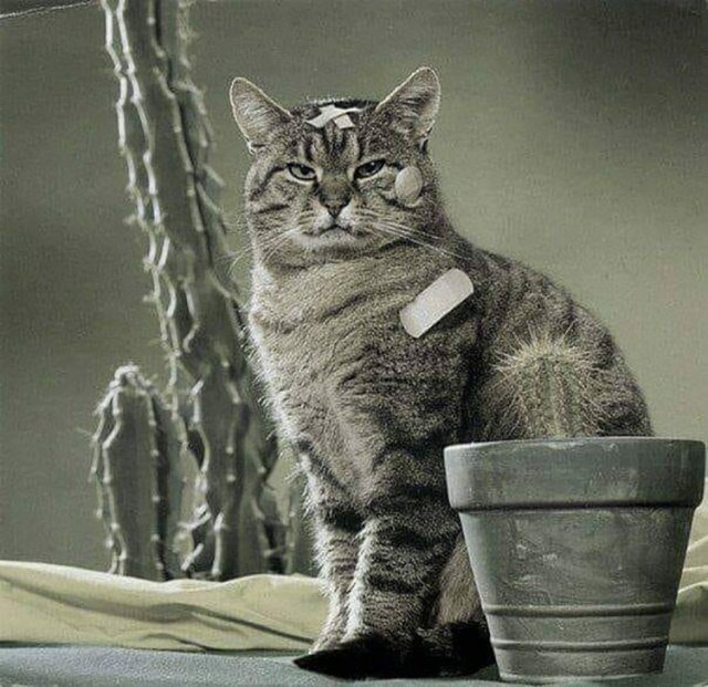 Ik heb een hekel aan cactussen : ze gunnen me geen plek tussen hen in ... Met hun stekels prikken ze kleine wondjes in mijn pelsje , zodat ik nu getooid ben met wondkussentjes . Het maakt me héél boos : ik kan niet alles winnen , maar boem ...wie het laatst lacht , het best lacht !
