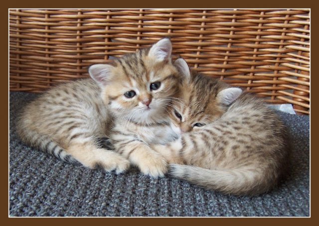 Twee snoezige kittens , die knus bij elkaar liggen op een zachte doek in een mandje , doen je ongetwijfeld vertederend kijken . Wat is het fijn om elkaars warmte te voelen ... De ideale wereld is voorlopig niet beschikbaar voor mensen : alles op afstand doen is zwaar voor hen . Ssst ... luister naar ons rustgevende spingeluid en glimlach !