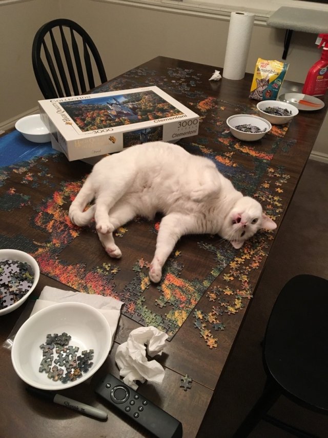 Om de ontstane zee van coronatijd te vullen is puzzelen weer populair geworden ... Poesjes vinden dit een uitstekend idee en willen hun steentje bijdragen . Ze leggen zich op het werkblad en verschuiven hier en daar een stukje dat zeker tot de oplossing leidt . Zijt gij een stukske kwijt ? Mijn poot redt je uit de nood !