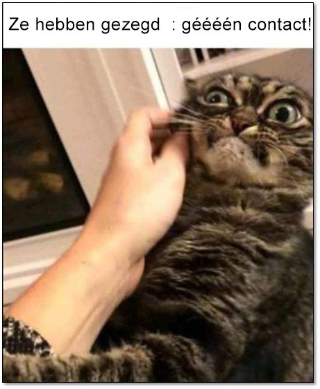 Met een boos snuitje wijs ik je toenadering resoluut af : geen contact hebben ze mij gezegd ... Is het dan zo moeilijk om je aan de voorgeschreven regels te houden ? Ik wil niet besmet en ziek worden : ik heb nog heel veel plannen om van het leven te genieten . Ik blijf in mijn kot en doe niet zot , ook al vind je dat rot !