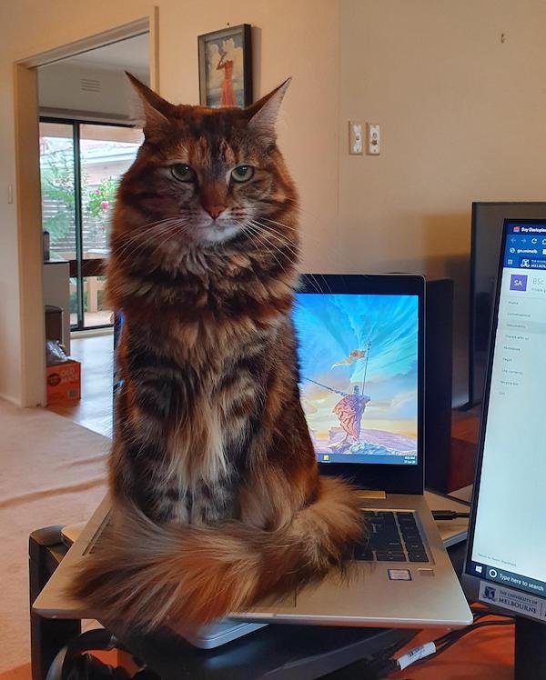 Ook ik , een imposante poes , heeft last van stress , want regelmaat in het huishouden is ver zoek nu iedereen thuis voor de computer zit . Daarom daag ik jullie uit door plaats te nemen op het klavier . Zoals een vrijheidsstrijder met wapperende vlag laat ik je weten dat ik onmiddellijk wil eten !
