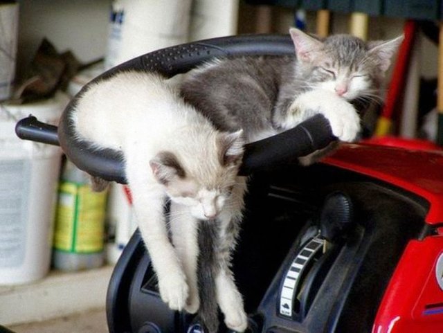 De lente lonkt en ik lig al klaar op het stuur van de tuinmaaimachine ... Ook Mimi wil erbij zijn , maar er is geen plaats genoeg en haar kopje , pootjes en staartje hangen naar beneden . Geduldig wachten we op het ideale moment om ons territorium super netjes te maken . Het motortje zal weer onze oortjes strelen en onze oogjes de kost geven !
