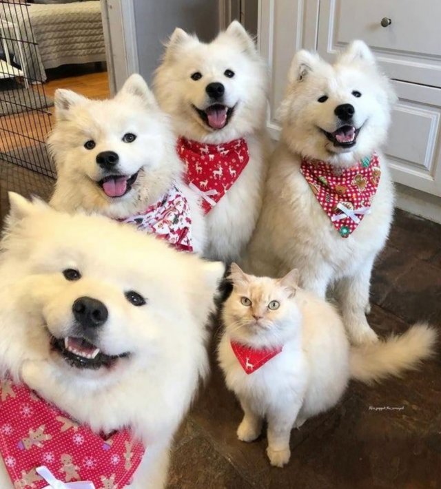 Omdat we allemaal wit zijn aan de buitenkant en een pittig slabbetje dragen , vormen we een leuke bende . Alle hondenmonden staan open , maar de mijne , als eenzame poes , blijft gesloten . De honden zijn niet op hun mondje gevallen , maar ik praat mijn mond niet voorbij en word geaccepteerd !