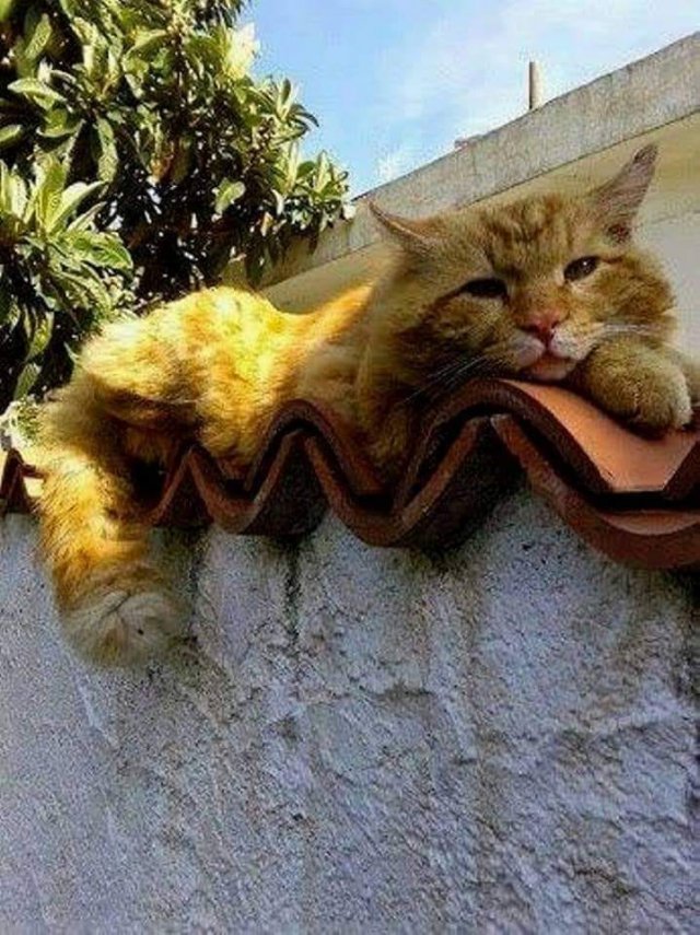 Ik lig gemakkelijk zo , want golvende dakpannen bieden me de mogelijkheid om mijn soepele lichaam comfortabel te installeren . Terwijl het ene deel wat hoger ligt en het andere wat lager ontstaat er weer evenwicht . Ik voel me zalig met dit vogelperspectief : hoog en droog als een inspirerende regenboog !