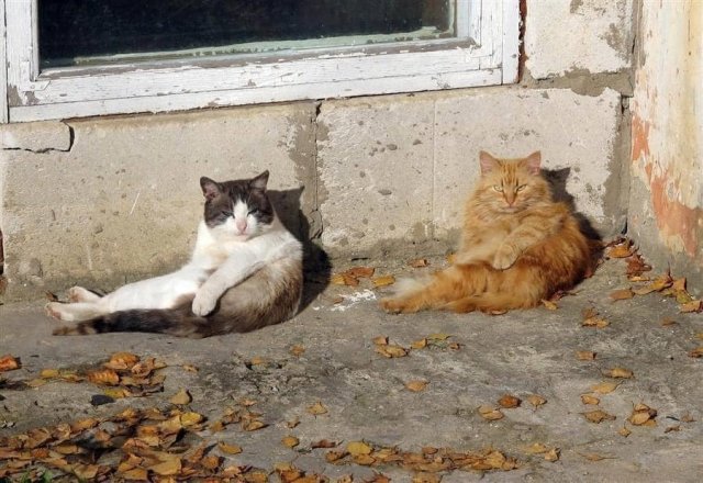 Wij houden van snoezen in het milde zonnetje op een beschut plekje . We liggen daar op identieke wijze , maar houden wel afstand . Een kat is een kat : ieder volwassen kat heeft zijn eigenheid die hij of zij gerespecteerd wil zien . Zijn of haar lichaamstaal spreekt boekdelen : laat ons met rust !