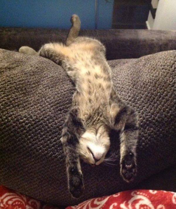 Een laaaang weekend en lekker niksen is broodnodig na een stressvolle week ... Ik heb mijn peren gezien met puppy Max die voortdurend met me wil spelen . Een senior poes is niet meer bestand tegen dat onstuimige gedrag . Met mijn kopje naar beneden en op mijn rug tracht ik mijn evenwicht weer te herstellen . Ik snak naar rust op een veilige kust !
