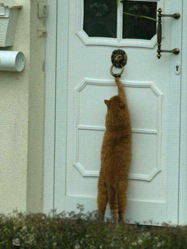 Mag ik binnen aub , leeuwenkop ? Omdat ik gemerkt heb dat ongeduldige kinderen niet alleen bellen maar ook met de ring in de leeuwenmuil bonken om binnen gelaten te worden , wil ik dat ook uittesten . Ik rek me volledig uit en strek mijn rechtervoorpoot ... Verdorie , zeg maar brute pech !