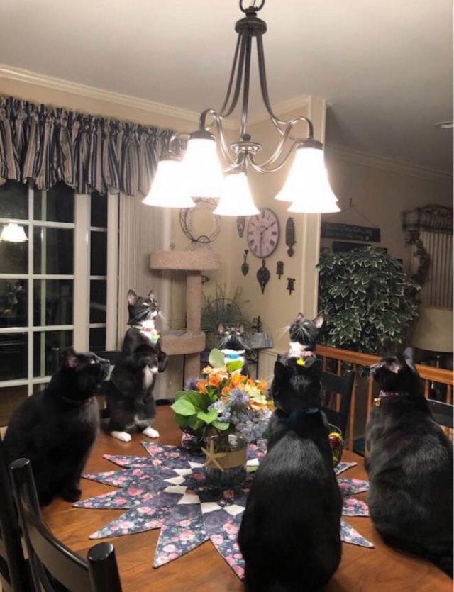 Wie is de waaghals die het zoemende insect bij de luchter durft vangen ? Met z'n zessen vergaderen we op de tafel , want we willen inspraak bij de keuze van nieuwe voedingsregels . Vegetarische korrels en insecten zijn niet zo smakelijk als brokjes met vlees en vis . We halen er onze neus voor op !