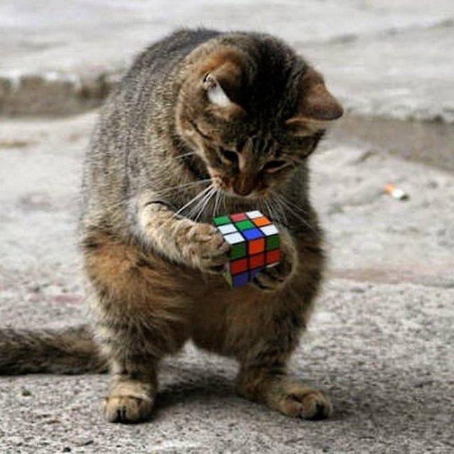 Hoe zorg ik ervoor dat alle kleuren netjes op orde geraken ? Keimoeilijk ... is niet overdreven ! Het kubusje boeit me , maar hoe goed ik ook mijn best doe , het lukt me niet . Zal ik het dan maar even laten rusten om via een snoesuurtje weer energie te verzamelen en verder te strijden ? Opgeven staat niet in mijn woordenboek !