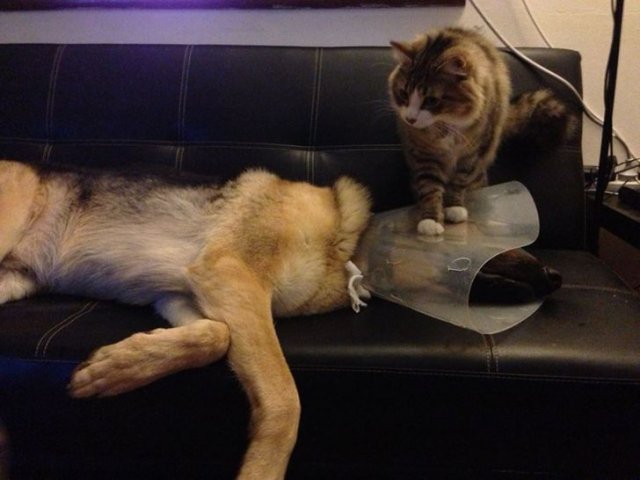 Opdat Woef niet aan zijn wonde zou komen , heeft hij van de veearts een plastic kapje gekregen om zijn kop . Daardoor voelt hij zich depressief , maar ik zet mijn voorpootjes op het omhulsel ." Dat is durven ," zeg je , maar mijn nabijheid kikkert hem zeker op door zin voor meer actie !