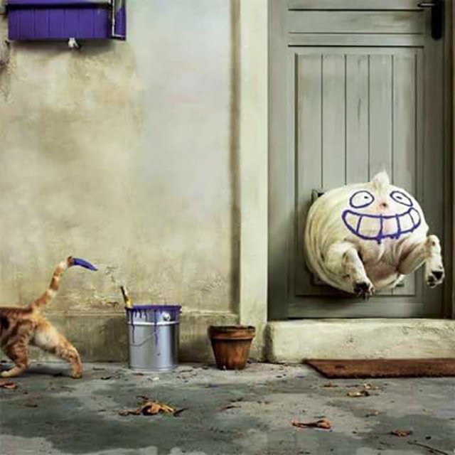 Ocharme Woef , je enthousiasme om me te bezoeken is een flater geworden . Kattenluikjes zijn alleen voor poezelige diertjes . Ik heb mijn schildertalent gebruikt om het kluchtig voor te stellen : keep on smiling ... Dit voorval krijgt zeker nog een staartje !