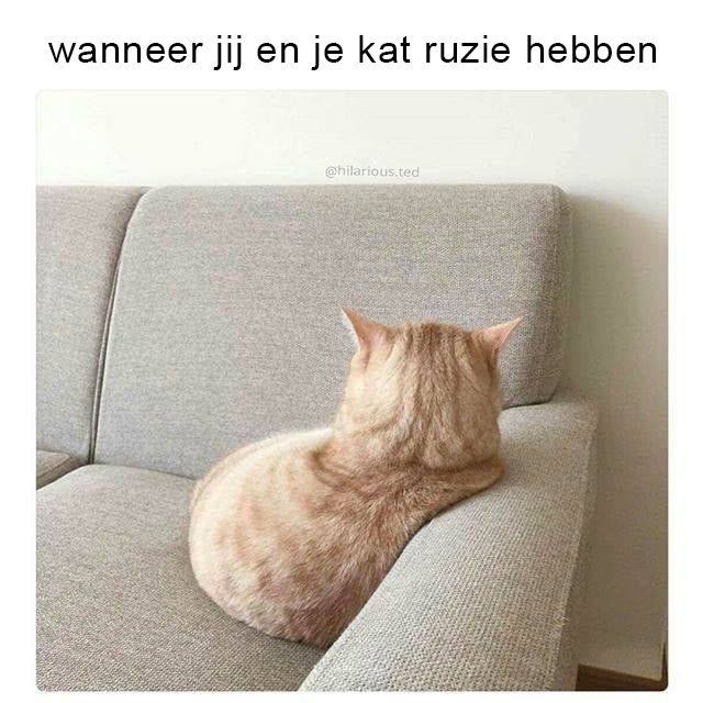 Wanneer jij en je kat ruzie hebben , toont Minneke poes haar rug : met heel Antwerpen maar niet met mij ... Dit duidelijke signaal wijst op afkeer : laat me met rust tot mijn boze bui over is . Tijd brengt raad tot honger opduikt . Je weet nooit wat een genstertje kan doen !