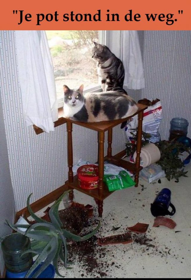 Het lentezonnetje lonkt : poesjes snakken naar op pad gaan ... Met z'n tweeën is er meer ruimte nodig en dat moeten de planten bekopen . Boem , ze vliegen de grond op . Alleen zou een poesje planten subtiel behandelen , maar met z'n tweeën is er discussie mogelijk . Foei poesjes , deze fout is stout !
