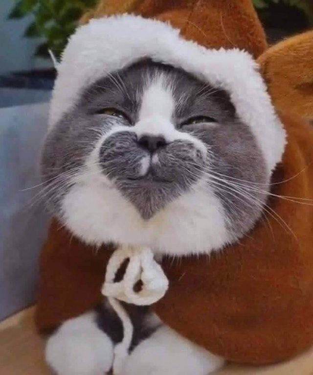 Glimlachen jullie ook omdat ik potsierlijk ben ingeduffeld ? In ieder geval trotseer ik hiermee de barre koude . Een zoetsappig , grijs hartje omringt mijn neusje en mondje , terwijl mijn oogjes spleetjes zijn . Vertroetel je hartendiefje : bye , bye , eenzaamheid !